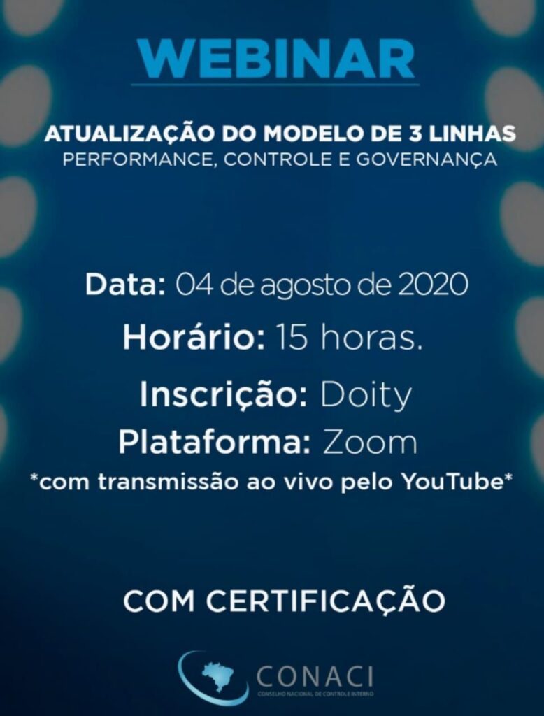 O webinar “Atualização do Modelo de 3 linhas: Performance, Controle e Governança” vai acontecer na terça-feira, 04 de agosto, às 15h. A transmissão será ao vivo pelo canal do Conselho Nacional de Controle Interno (CONACI) no YouTube, com certificação pelo Conselho. O evento vai focar nos principais pontos desta atualização e no seu impacto na atividade de auditoria interna.